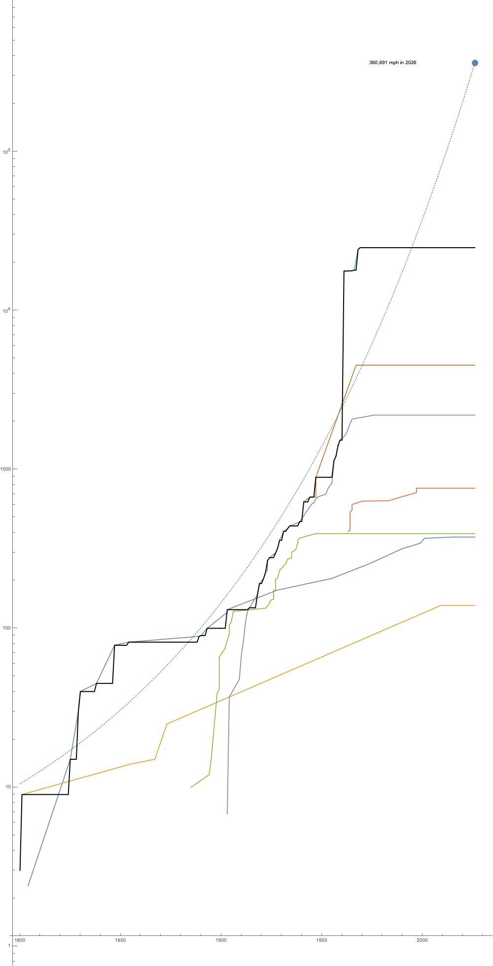 There had been an incredible improvement in transportation starting around 1820. We went from barges and horses to trains, to automobiles, to planes, to jet airplanes, to space craft. The top speeds went from 10 mph, to 100 mph, to 1000 mph to 10,000 mph, improving exponentially over the decades.